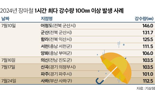 그는 또 “기존 장마는 동서로 긴 정체전선이 형성돼 남북을 오르내리며 전국에 오랜 기간 비가 내리는 형태였지만, 최근에는 남북으로 폭이 좁고 강한 정체전선이 발달해 강한 비를 뿌리는 게 특징”이라며 “같은 시·군·구인데도 지역간 강수량 편차가 최대 10배 이상 나타나기도 한다”고 말했다. 이 통보관에 따르면 실제 지난해 7월 전북 군산 137.7㎜, 충남 서천 111.5㎜ 등 1시간 최다 강수량 100㎜를 넘는 사례가 전국 9개 지점에서 관측됐다.