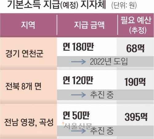 농촌 기본소득 도입은 경기도와 전북, 전남 등이 적극적이다. 경기 연천군은 2022년부터 청산면 주민 모두에게 매월 15만원을 지역화폐로 지급하는 기본소득 시범사업을 하고 있다. 전북은 8개 면에서 기본소득 시범사업을 추진 중이다. 1인당 월 10만원씩, 연간 190억원가량이 소요될 것으로 전망된다. 전북도 관계자는 8일 “기본소득제는 보건복지부 사회보장제도 심의회를 거쳐야 하는 만큼 지난 3월 신청서를 내고 협의 중이다”고 했다. 전남도는 지난 3월 1인당 연간 50만원의 ‘전남형 기본소득’ 지급을 위한 조례를 제정하고 시범사업에 착수했다.