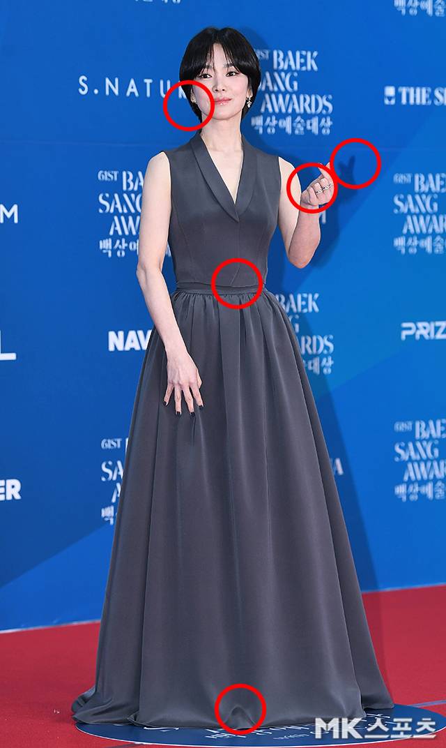 송혜교는 시상식에 앞서 진행된 레드카펫 행사에서 그레이 컬러의 슈트 베스트와 롱스커트 셋업을 선택해 차분하고 무게감 있는 레드카펫 패션을 완성했습니다.