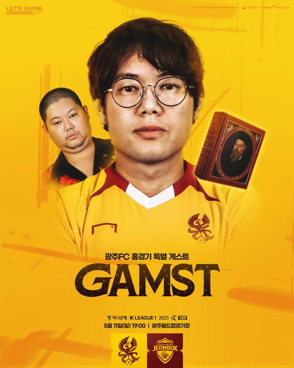 광주는 오는 11일 19시 광주월드컵경기장에서 열리는 하나은행 K리그1 2025 13라운드 전북현대와의 홈 경기에서 유튜브 구독자 285만 명을 자랑하는 축구 크리에이터 감스트와 함께한다고 밝혔다. 홍보 포스터에는 감스트의 '역대급' 멀끔한 사진과 더불어 그를 못알아보는 팬이 없도록 대표적인 사진을 함께 실었다.
