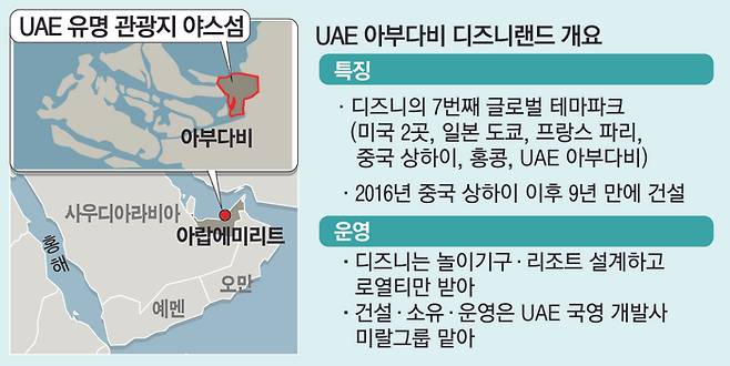 디즈니는 이날 성명에서 “전 세계 인구의 3분의 1가량이 비행기로 4시간 안에 올 수 있는 곳에 있는 UAE는 관광의 중요한 관문”이라며 “매년 1억2000만명의 승객이 매년 아부다비와 두바이 공항을 경유함에 따라 UAE는 세계에서 가장 큰 글로벌 항공 허브가 되고 있다”고 밝혔다.