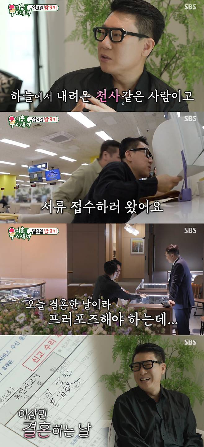 오는 11일 방송되는 SBS '미운 우리 새끼'에서는 이상민의 재혼 스토리가 공개될 예정이다. 최근 공개된 예고편에서 이상민은 아내에 대해 "하늘에서 내려온 천사 같은 사람"이라며 애정을 드러냈다.