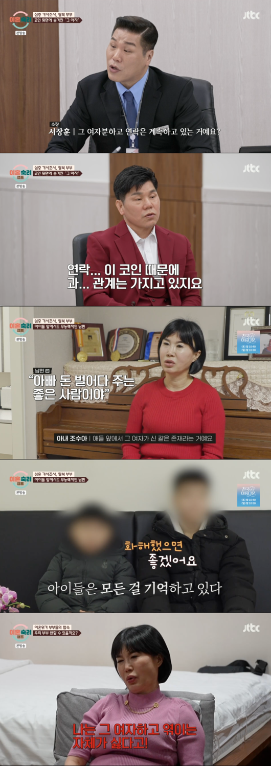 투자 및 코인의 돈이 5억이 넘느냐는 말에 아내는 더 넘는다고 했지만, 남편은 아니라고 반박했다. 심지어 코인을 소개해준 사람에는 남편이 아는 여자가 끼어있다고. 남편은 코인 때문에 그 여자와 계속 연락을 하고 있다고 밝혔다.