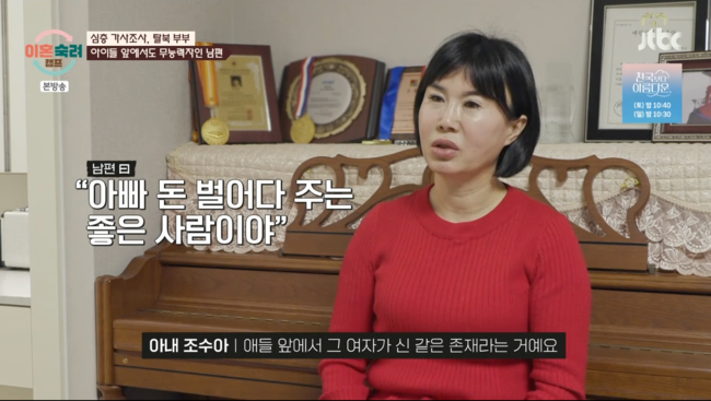남편은 결혼 전 경마 도박을 했다는 사실이 공개되기도. 경마 도박 사건으로 부부는 이혼 위기를 겪었다고 전했다. 잘못할 때마다 남편은 각서를 쓰며 용서를 빌었다고 덧붙였다. 이로 인해 아내는 극심한 우울증을 겪고 있었다.