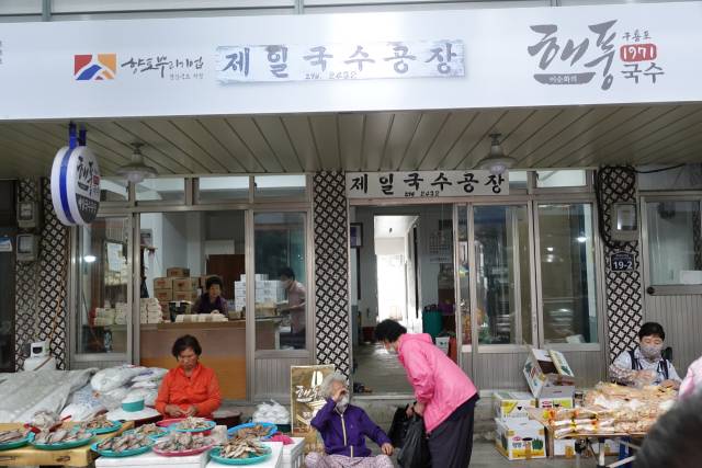 한창때 구룡포는 국수공장이 상당히 많이 있었다. 읍내에만 무려 7개. 마지막까지 살아남은 게 제일국수이다. 타일로 마감된 70년대식 277.2㎡(84평) 크기의 건물이다. 외관이 꽤 그럴듯하고 빈티지 스러운 분위기도 풍겨 관광객에게는 포토존으로 인기가 높다.