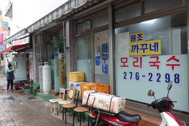 가장 유명한 업소는 선모텔 뒷골목에 있는 '까꾸네'. 바로 이 집 때문에 구룡포가 모리국수촌으로 변모했다 해도 과언은 아니다. 이 집은 풍국면 국수를 사용한다. 고춧가루를 정말 미련없이 푸짐하게 투하하는 게 특징이다. 어느 날부터 소문 탓에 관광객으로 들끓는다. 그래서 토박이들은 슬그머니 이웃 식당에 더 애정을 준다. 바로 '모정식당'이다. 마치 진주비빔밥도 관광객은 '천황식당', 토박이는 중앙시장 내 '제일식당'을 선호하는 것처럼.