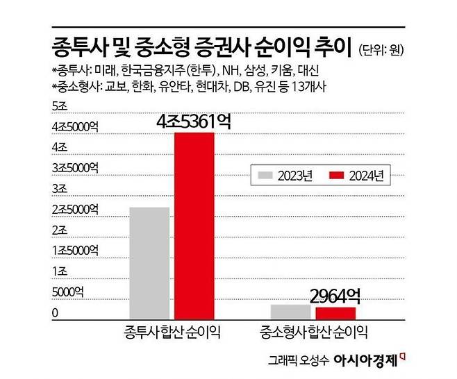 9일 에프앤가이드에 따르면 주식시장에 상장된 미래에셋증권·한국금융지주(한국투자증권) 등 증권사 19곳의 작년 연결기준 순이익은 4조8325억원이다. 하지만 상장 증권사 순이익의 대부분은 자기자본 3조원 이상 등의 기준을 충족한 종투사에 집중됐다.