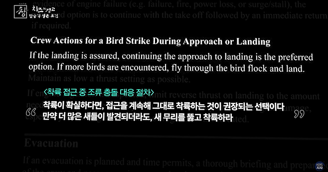 보잉 쪽에서 새 떼가 있다면 그거를 뚫고 지나가라고 하는 게 아니라 착륙이 임박한 상황 수 초 안에 착륙이 가능한 상황에서는 항공기가 복행을 하는 것보다는 착륙을 하는 것을 하나의 선택지로 생각할 수 있다고 얘기를 해주는 겁니다.