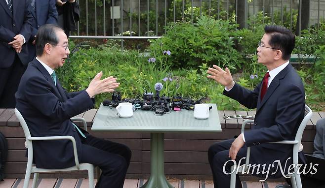 | ▲ 김문수 국민의힘 대선 후보와 한덕수 무소속 대선 예비후보가 8일 서울 여의도 국회 강변서재에서 후보 단일화와 관련해 회동하고 있다. |