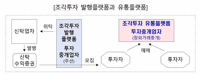 조각투자 유통 플랫폼도 제도권 안으로 편입된다. 부동산, 음악저작권 등 신탁 기반 자산을 소액 단위로 나눠 거래하는 방식으로 해당 플랫폼 역시 투자중개업 인가를 받아야 한다. 자자가 적절한 정보를 바탕으로 판단할 수 있도록 신탁재산 관련 주요 정보를 분기마다 공시해야 한다. 다만 유통 플랫폼 사업자나 그 특수관계인이 해당 조각투자 상품을 발행하거나 인수한 경우 이해상충 소지가 있는만큼 유통을 제한키로 했다.