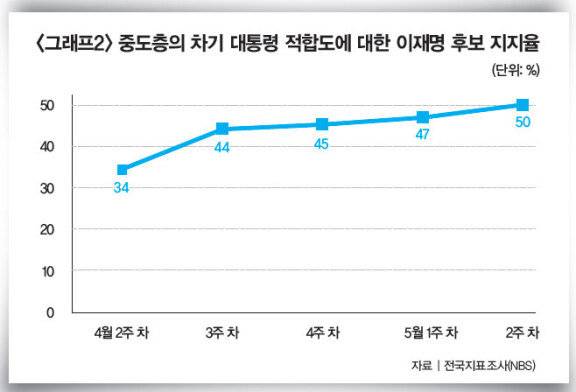 특히 중도층 지지세가 눈에 띈다. 동아일보 의뢰로 여론조사 전문기관 리서치앤리서치가 실시한 5월 4~5일 여론조사(전국 18세 이상 남녀 1013명 대상 무선 전화면접 방식, 표본오차는 95% 신뢰 수준에서 ±3.1%p)에 따르면 중도층에서 이 후보 지지율은 53.9%로 가장 높았다. 전국지표조사(NBS) 여론조사(5월 5~7일 전국 18세 이상 남녀 1000명 대상 무선 전화면접 방식, 표본오차는 95% 신뢰 수준에서 ±3.1%p)에서도 중도층의 이 후보에 대한 지지율은 50%를 기록했다(그래프2 참조).