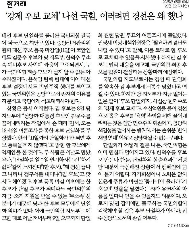 한겨레 = '강제 후보 교체' 나선 국힘, 이러려면 경선은 왜 했나