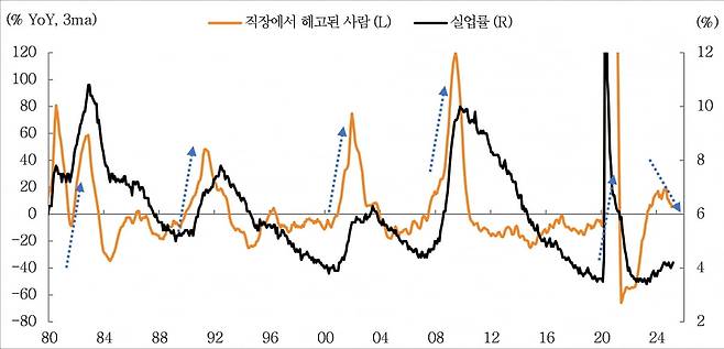 앞서 언급한 월러 이사의 발언에서 점검할 두 번째 부분은 실업률 상승 폭이다. BLS의 실업자 분류에 따르면 직장에서 해고된 사람과 노동시장에 다시 참가하기 위해 진입한 구직자들이 23~24년에 비해 늘어났다. 해고된 실직자를 전년 대비 증가율로 계산할 경우 실업률에 대체로 선행하는 경향을 보였다. 현재 국면에서는 해고된 실직자들의 증가율이 둔화하는 흐름을 기록하고 있다. 실업률의 급격한 상승 가능성이 제한적이라고 판단하는 첫 번째 이유다.