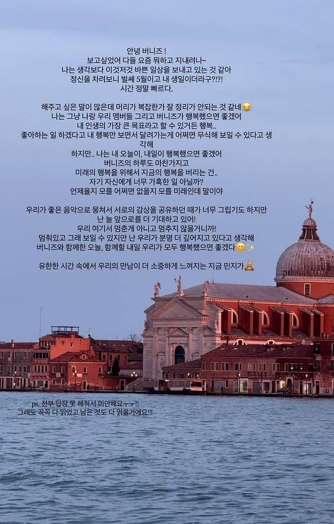 버니즈(팬덤명)에 근황을 전했다. "난 생각보다 바쁜 일상을 보내고 있다"며 "정신 차려보니 내 생일이다. 시간 정말 빠르다"고 했다.
