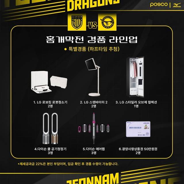 하프타임 특별경품 추첨을 통해 LG 로보킹 로봇청소기, LG 스탠바이미 2, LG 스타일러, 다이슨 쿨 공기청정기, 다이슨 에어랩, 광양사랑상품권(50만원권) 등 푸짐한 경품이 제공되며, 일반 경품으로는 광양사랑상품권(10만 원권), 디오션 워터파크 입장권, 메가박스 영화관람권 등이 전자추첨을 통해 팬들에게 돌아갈 예정이다.