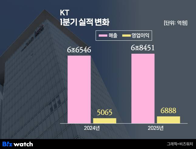KT는 올해 1분기 연결기준 매출이 전년 동기 대비 2.9% 증가한 6조8451억원으로 잠정 집계됐다고 9일 공시했다. 같은 기간 영업이익은 36.0% 증가한 6888억원이다.