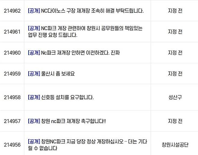창원시설공단 민원게시판인 '고객의 소리'에는 NC 구장 재개장을 향한 시민들의 항의가 빗발쳤다. "야구가 없어 상권이 어려워졌다" "상인들의 목소리를 외면하지 말아달라" 등 직접적 타격을 받은 상인들의 호소가 특히 줄을 잇고 있다. 답변 내용이 붙여넣기 식 천편일률이지만 어쨌든 문의에 응답을 내놓았던 것도 5월 2~6일 장기 휴가 이후에는 뚝 끊겼다. 그나마 답변이 완료된 소수 게시글은 야구장과 무관한 기타 시설 이용에 대한 문의였다. 창원시청 민원 게시판에도 마찬가지로 야구장 주변 상인들과 야구팬들의 원성이 끊임없이 이어지고 있는 상황이다.