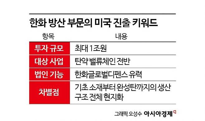 업계에서도 한화글로벌디펜스가 향후 미국 시장에서 핵심 플랫폼이 될 수 있다는 관측이 나온다. 특히 미국은 해외 방산업체의 계약 참여 시 자국 내 법인이나 인력 기반을 요구하는 사례가 적지 않다. 업계 관계자는 "기초소재부터 조립까지 일부 공정을 미국에 구축한다면 탄약 공급망 자립을 추진 중인 미국 정책과도 부합할 수 있다"며 "향후 현지 조달 시장에서 전략적 우위를 갖는 기반이 될 수 있다"고 말했다.