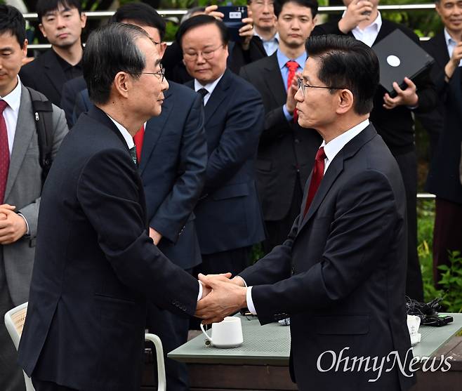 | ▲ 김문수 국민의힘 대선후보와 한덕수 무소속 대선 예비후보가 8일 서울 여의도 국회 강변서재에서 회동을 마친 후 인사하고 있다. |