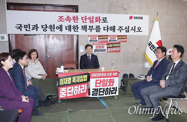 | ▲ 권성동 국민의힘 원내대표가 9일 서울 여의도 국회에서 김문수 당 대선 후보를 향해 무소속 한덕수 예비후보와의 조속한 단일화를 촉구하며 단식 농성을 하고 있다. |