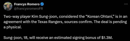 로메로 기자는 "'한국의 오타니'로 불리는 투웨이 플레이어 김성준이 텍사스 레인저스와 계약을 체결했다고 확인했다. 현재 신체검사 절차를 기다리는 상태"라며 "이 18세 한국인 선수는 약 130만 달러(한화 약 18억원) 계약금을 받을 것으로 추정된다"라고 주장했다.