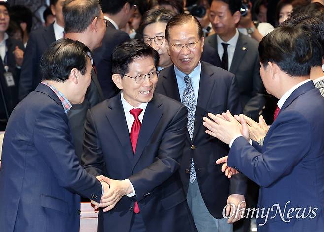 | ▲ 김문수 국민의힘 대선 후보가 9일 서울 여의도 국회에서 열린 의원총회에 참석하며 의원들의 기립 박수를 받고 있다. 뒤는 권영세 비상대책위원장과 권성동 원내대표. |