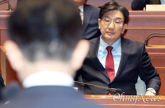 | ▲ 권성동 국민의힘 원내대표가 9일 서울 여의도 국회에서 열린 의원총회에서 김문수 대선 후보의 발언을 듣고 있다. |