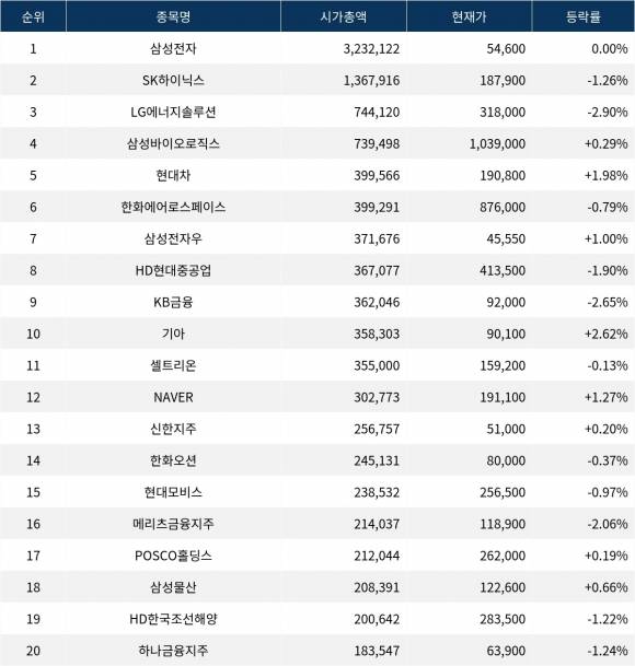 한편 시가총액 20위권 종목들은 셀트리온(068270) ▼0.13%, NAVER(035420) ▲1.27%, 신한지주(055550) ▲0.20%, 한화오션(042660) ▼0.37%, 현대모비스(012330) ▼0.97%, 메리츠금융지주(138040) ▼2.06%, POSCO홀딩스(005490) ▲0.19%, 삼성물산(028260) ▲0.66%, HD한국조선해양(009540) ▼1.22%, 하나금융지주(086790) ▼1.24% 등의 성적을 기록하고 있다.