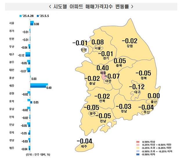 세종이 크게 오르고 5대광역시(-0.07%→-0.06%)와 8개 도(-0.05%→-0.02%)의 하락폭이 축소되면서 지방(-0.05%→-0.03%)은 하락폭 축소됐다.