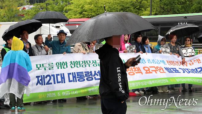 | ▲ 모두를 위한 친환경무상급식 대전환! 대선 5대 정책 요구안 발표! 친환경무상급식풀뿌리국민연대 주최로 9일 오전 서울 종로구 광화문광장에서 열린 '모두를 위한 친환경무상급식 대전환! 국가책임 공공급식! 친환경기후급식! 제21대 대통령선거 5대 정책 요구안 발표 기자회견'에서 참석자들이 5대 정책 요구안을 발표하고 있다. |