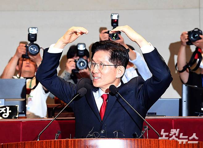 꽃 받고 하트 그린 김문수, 지도부 주도 단일화 '거부' 퇴장[노컷네컷]
