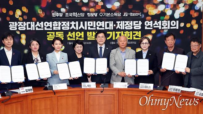 | ▲ 민주·진보 후보 단일화...김재연 "이재명 후보 지지" 더불어민주당·조국혁신당·진보당·사회민주당·기본소득당 등 5개 정당이 9일 서울 여의도 국회에서 진보인사들이 모인 광장대선연합정치시민연대(광장연대)와 기자회견을 갖고 이재명 더불어민주당 대선후보를 단일후보로 지지한다는 공동 선언문을 발표하고 있다. |