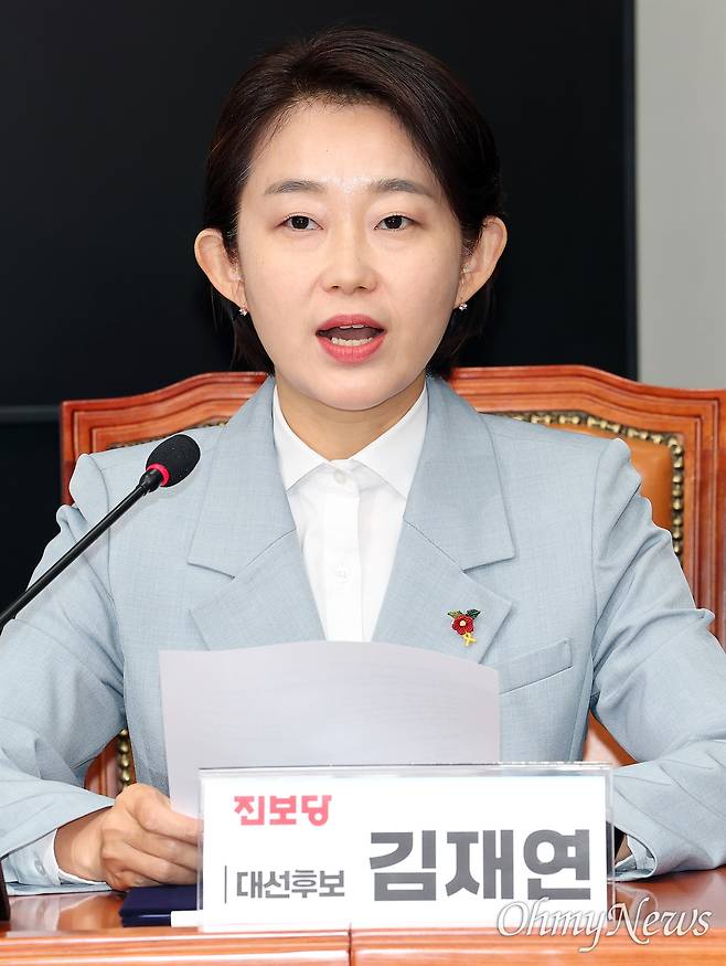 김재연 진보당 대선후보가 9일 서울 여의도 국회에서 열린 광장대선연합정치시민연대-제정당 연석회의 공동 선언 발표 기자회견에서 이재명 더불어민주당 대선후보 지지 의사를 밝히며 대선 불출마를 선언하고 있다.