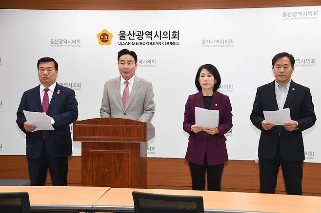 | ▲ (왼쪽부터)국민의힘 울산 남구갑 이장걸·이정훈 시의원과 이소영·이지현 남구의원이 9일 시의회 프레스센터에서 기자회견을 열고 김상욱 의원의 탈당을 규탄한다고 밝혔다. |