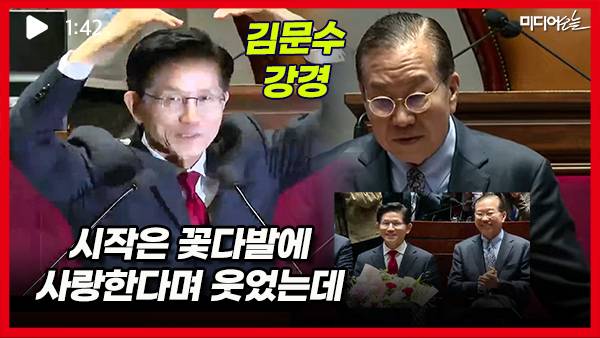 9일 국민의힘 의원총회는 당 지도부가 의총에 참석한 김문수 후보에게 꽃다발을 전달하고 김 후보도 모두 발언 시작 때 두 팔로 하트 모양을 만들며 의원들에게 사랑한다고 하는 등 화기애애하게 시작했다. 실제 첫 모두 발언에 나선 권성동 원내대표도 “우리 김문수 후보님이 살아온 삶의 궤적을 한마디로 표현하면 가장 낮은 곳에서 가장 뜨겁게 살아오신 분이다. 여기 있는 107명의 국회의원은 모두 15대 국회에 등원하신 김문수, 홍준표 등 기라성 같은 선배님들의 맹활약을 보고 자란 후배들”이라며 “경기지사 재임 시절에는 GTX, 판교 테크노밸리와 같은 굵직굵직한 사업들을 추진하셨는데, 이재명 같은 구설수는 단 한 번도 없었던 그야말로 청렴결백의 아이콘이었다”고 치켜세웠다.