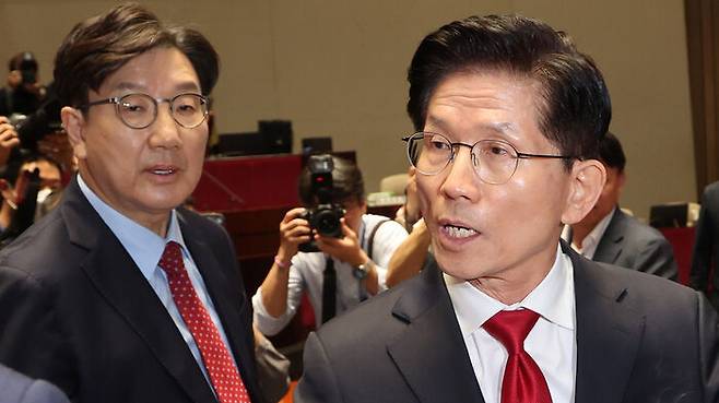 국민의힘 권영세 비상대책위원장과 권성동 원내대표 등은 오늘 국회에서 열린 의원총회에 참석하는 김 후보를 웃으며 맞이했습니다.