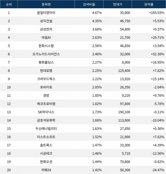 이어 검색비율 2위의 상지건설(042940)은 상승률 5.53%로 상승 마감했다. 검색비율 3위의 삼성전자(005930)는 0.37% 상승 마감했다. 검색비율 4위 마음AI(377480)는 29.71% 폭등했다. 검색비율 5위 한화시스템(272210)은 3.54% 상승했다.