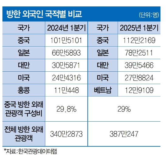 한국관광데이터랩에 따르면 2025년 1분기 한국을 찾은 중국인 관광객은 112만 2169명으로 전년 동기(101만 5101명) 대비 10.5% 증가했다. 더욱 눈길 끄는 건 씀씀이 증가세다. 국내 시장점유율 1위 택스리펀드 업체 글로벌텍스프리 통계 기준 올 1분기 중국인 관광객의 총 판매금액(관광객이 구매한 상품 중 세금환급 신청이 가능한 물품의 판매 총액)은 3942억여 원으로 전년 동기(약 2256억 원) 대비 74.7% 폭증했다. 이에 따라 1인당 평균 판매액은 2024년 1분기 약 22만 2000원에서 2025년 1분기 약 35만 1000원으로 58.1% 급증, 중국인 큰손들의 구매력이 여실히 드러났다.