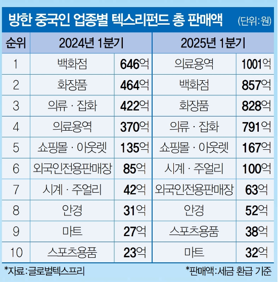 특히 업종별 변화에서 의료용역(의료관광) 분야의 성장이 독보적이다. 글로벌텍스프리에 따르면 올 1분기 중국인 관광객 대상 의료용역 총 판매금액은 약 1001억 원으로 전년 동기(약 370억 원) 대비 170.4% 폭증했다. 업종별 순위도 지난해 1분기 4위에서 올해 같은 기간 단숨에 1위로 올라섰다. 건수 또한 141.1% 급증한 6만 1006건에 달했으며, 건당 평균 소비액도 약 164만 원으로 껑충 뛰었다. 전체 방한 중국인 관광객 기준 1인당 의료용역 소비액은 144.4% 증가한 8만 9000원으로 집계됐다.