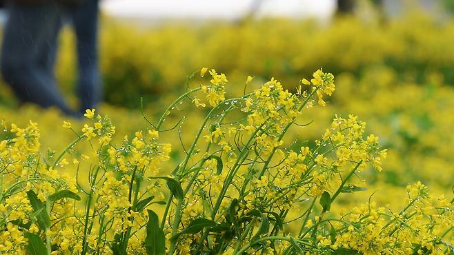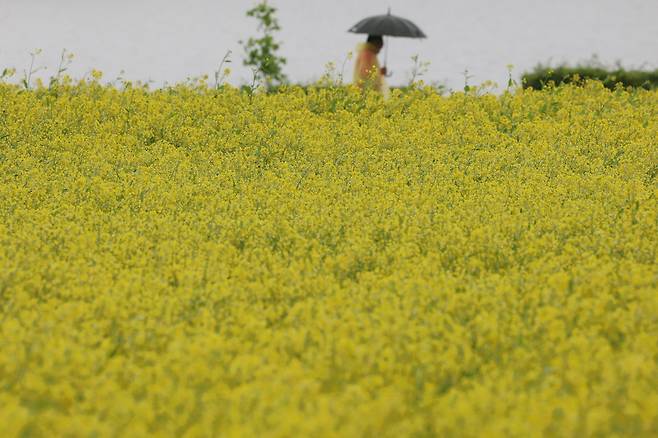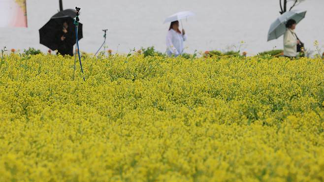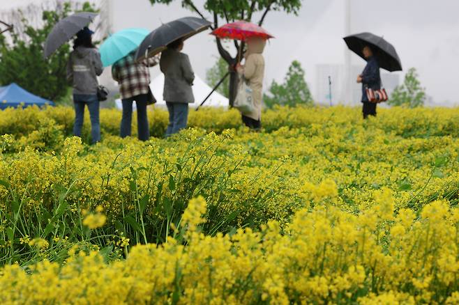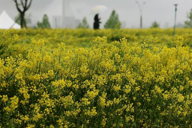 비 오는 날씨에도 구리한강시민공원을 찾은 시민들은 우산을 쓰고 유채꽃밭을 걸었다.