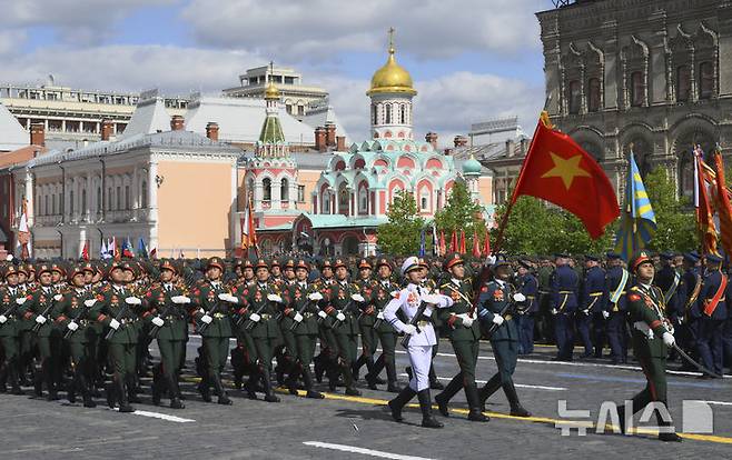 [모스크바=AP/뉴시스] 9일(현지 시간) 러시아 모스크바 붉은광장에서 열린 제2차 세계대전 승리 80주년(전승절) 기념 열병식에서 베트남 군인들이 행진하고 있다. 2025.05.09.