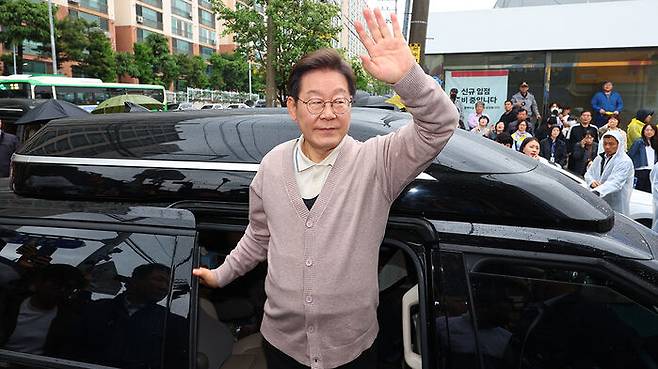 ▲ 더불어민주당 이재명 대선 후보가 제3차 골목골목 경청투어로 경북지역 방문에 나선 9일 경북 칠곡군 석적읍 방문을 마친 뒤 다음 일정으로 이동하며 지지자들에게 인사하고 있다.