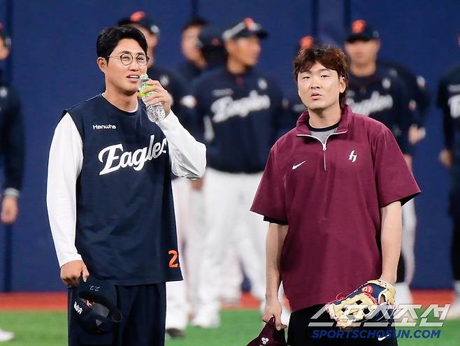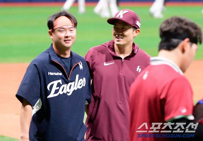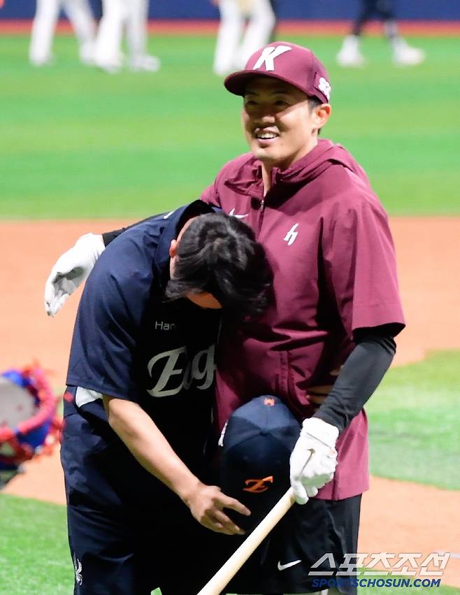 이때 3루쪽 더그아웃 앞에서 버건디 유니폼을 입은 키움 선수가 누군가를 기다렸다. 키움 이형종이 한화 양상문 투수코치를 기다리고 있었던 것.