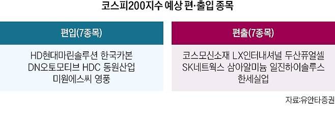한국카본과 HDC도 편입 거론 종목이다. 최근 1년 주가 상승률이 83.04%, 127.38%에 달한다. 패시브 펀드의 예상 순매수 규모도 각각 213억원, 160억원으로 적지 않다. 고경범 유안타증권 연구원은 “편입 종목 전반에 매수세 유입이 기대되지만 HD현대마린솔루션은 주요 주주의 오버행(잠재적 매도 물량) 부담, DN오토모티브는 최근 DN솔루션즈 상장 철회 여파 등을 면밀히 따져야 한다”고 평가했다.