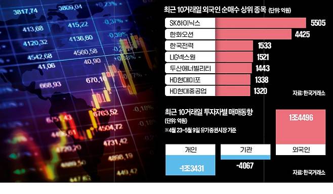 9일 한국거래소에 따르면 외국인 투자자는 최근 10거래일(4월 23일~5월 9일)에 유가증권시장에서 1조4496억원어치 주식을 순매수한 것으로 나타났다.