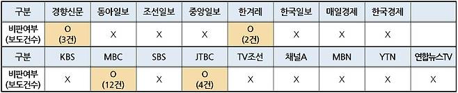 | ▲ 방송사 저녁종합뉴스·신문 지면 ‘이재명 후보 선거법 사건 대법원 파기환송심’ 비판여부(5/1~5/3) |