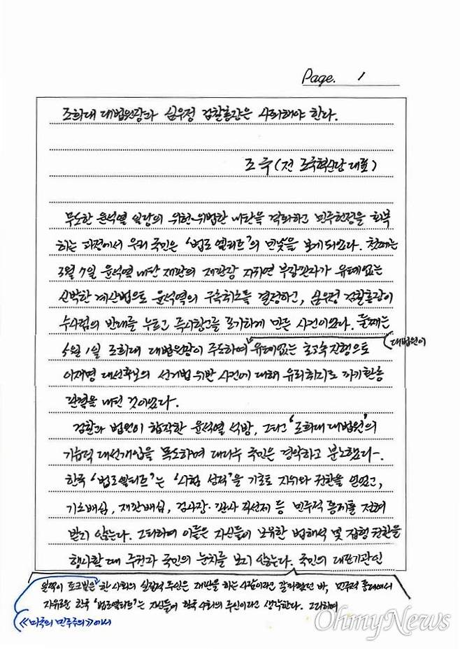 | ▲ 조국 전 조국혁신당 대표가 <오마이뉴스>에 보내온 자필 편지 |