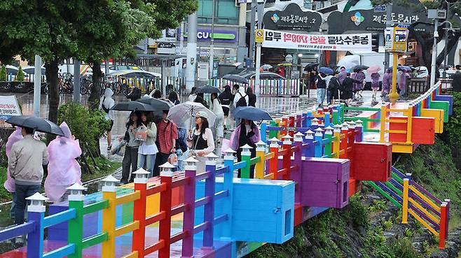 ▲ 제주도에 호우특보가 내려진 9일 오전 제주시 산지천 인근에서 수학여행 온 학생들이 우산을 쓰고 이동하고 있다.