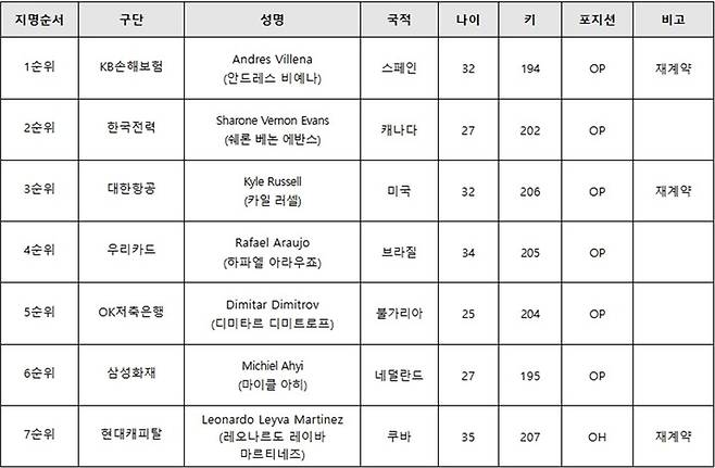 이에 따라 우리카드, 삼성화재, 한국전력, OK저축은행 4개 구단만 새로운 외인을 맞이했다.