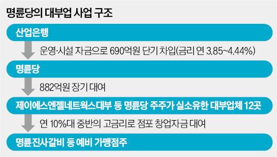 9일 금융감독원에 따르면 명륜당은 지난해 말 기준 제이에스엔젤네트웍스대부와 디와이엔젤네트웍스대부 등 12곳의 특수관계자인 대부업체에 총 822억원을 장기 대여금으로 빌려줬다. 이들 대부업체는 명륜당 주주가 실소유주로 파악된다. 명륜당에서 빌린 자금으로 명륜진사갈비와 샤브올데이 점포를 내려는 이들에게 창업 자금을 융통해주는 역할을 한다. 대부업체들의 금리는 연 10%대 중반으로 시중은행 대출 금리를 훌쩍 뛰어넘는 수준이다.